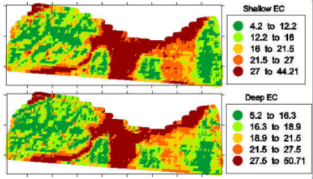 4 局部的降雨差異一般不至于導(dǎo)致土壤含水量差異大到足夠引起電導(dǎo)的差異,因為土壤電導(dǎo)測量技術(shù)測量的是0-3英尺(90cm)整個剖面的EC,受表面土壤水的影響較小。