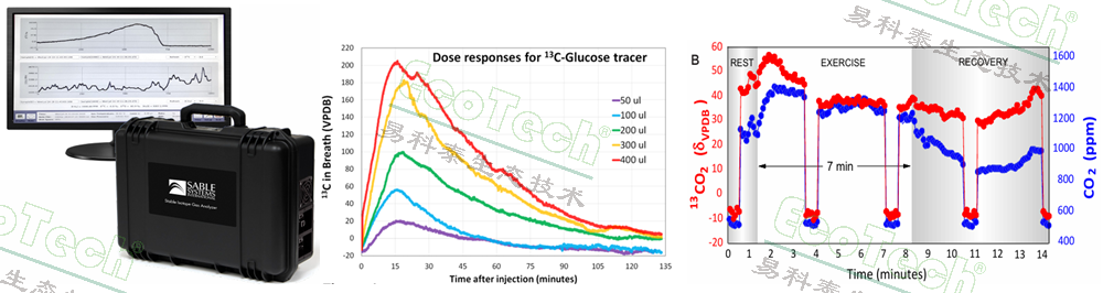 動(dòng)物呼吸代謝測(cè)量可以得到二氧化碳產(chǎn)量、耗氧量、呼吸商等能量代謝指標(biāo),但不能跟蹤研究三種不同營(yíng)養(yǎng)物質(zhì)(能量來(lái)源物質(zhì)如蛋白質(zhì)、脂肪及碳水化合物)的實(shí)際利用情況,特別是外源性與內(nèi)源性營(yíng)養(yǎng)物的氧化等。國(guó)際知名動(dòng)物能量代謝技術(shù)公司Sable Systems International新推出了動(dòng)物呼吸穩(wěn)定同位素氣體分析儀,可與動(dòng)物呼吸代謝測(cè)量系統(tǒng)搭配用于動(dòng)物穩(wěn)定同位素呼吸代謝檢測(cè)以深入研究分析其能量代謝跟蹤底物消耗情況。該系統(tǒng)可廣泛應(yīng)用于昆蟲、鳥類、蜥蜴、實(shí)驗(yàn)大小鼠、家畜家禽、靈長(zhǎng)類等各種實(shí)驗(yàn)動(dòng)物,以及人體碳同位素呼吸與能量代謝實(shí)時(shí)監(jiān)測(cè),非常有助于推動(dòng)動(dòng)物生理生態(tài)、營(yíng)養(yǎng)學(xué)、比較生理學(xué)、運(yùn)動(dòng)科學(xué)、病理學(xué)、生物醫(yī)學(xué)等領(lǐng)域生物新陳代謝創(chuàng)新研究。