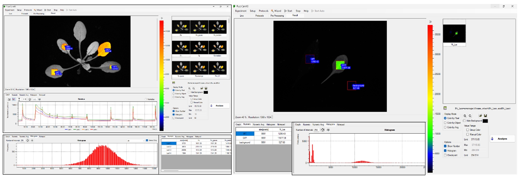 - FluorCam葉綠素?zé)晒獬上穹治鲕浖δ埽壕週ive(實(shí)況測(cè)試)、Protocols(實(shí)驗(yàn)程序選擇定制)、Pre–processing(成像預(yù)處理)、Result(成像分析結(jié)果)等功能菜單