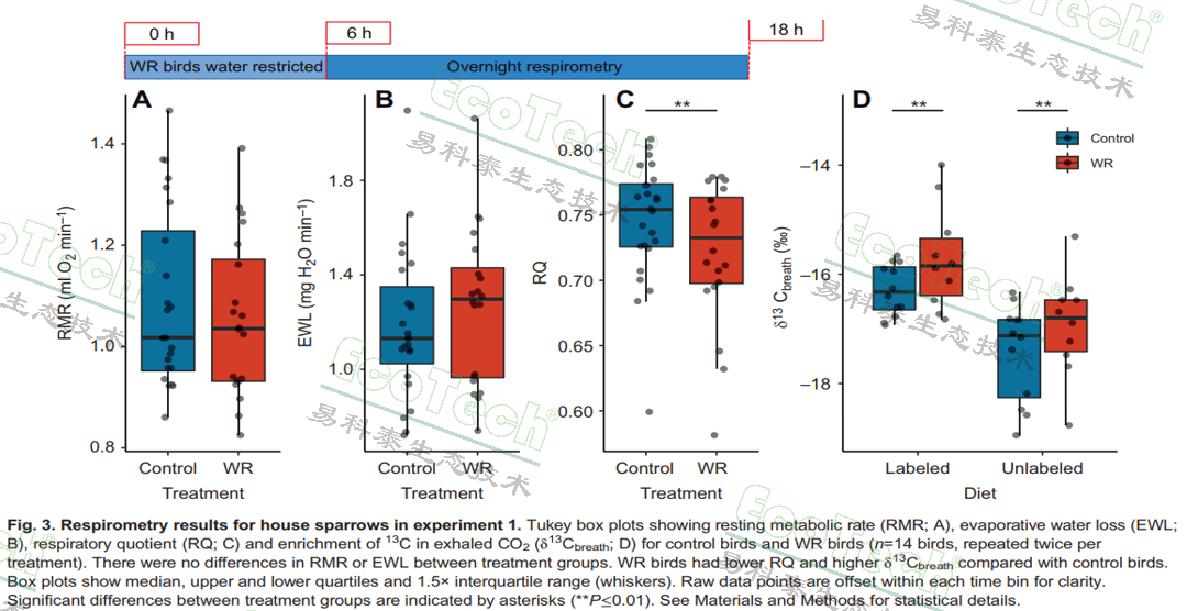 研究者給圈養(yǎng)的家麻雀喂食13C標(biāo)記的亮氨酸9周,以標(biāo)記內(nèi)源性蛋白質(zhì)。每周進(jìn)行一次試驗(yàn),在此期間,測(cè)量了對(duì)限水的生理反應(yīng),如瘦體重、脂肪量、新陳代謝的變化以及呼出二氧化碳中13C 的富集(δ13Cbreath)。研究發(fā)現(xiàn),限水的鳥類分解代謝了更多的瘦肉組織,并且還富集了δ13Cbreath以響應(yīng)限水。然而,δ13Cbreath隨代謝率和限水期的長短而變化,這表明當(dāng)可以使用其它生理策略實(shí)現(xiàn)水分平衡時(shí),鳥類可能會(huì)節(jié)省蛋白質(zhì)。