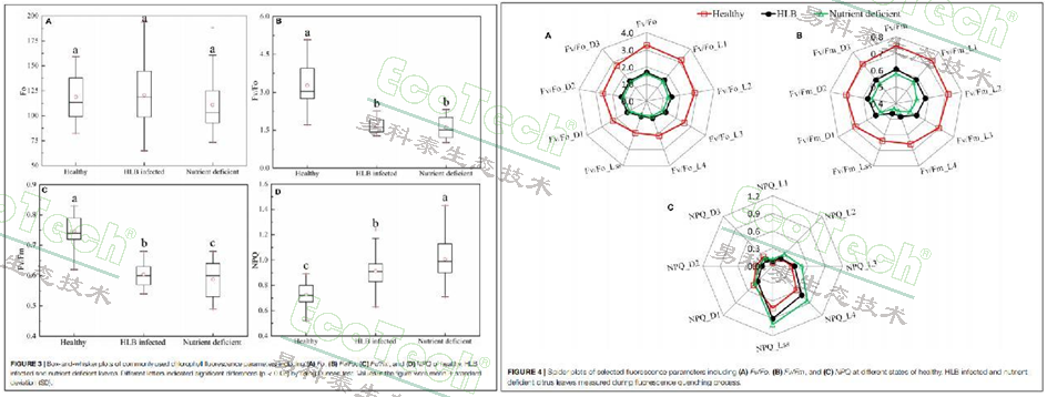 通過(guò)分析葉綠素?zé)晒獬上癯S脜?shù),確定黃龍病對(duì)柑橘葉片的影響;通過(guò)蜘蛛圖法分析了與脅迫誘導(dǎo)光合作用過(guò)程變化相關(guān)的葉綠素?zé)晒獯銣鐓?shù),反映了不同葉片條件下熒光參數(shù)的相對(duì)變化。與健康樣本相比,HLB感染、營(yíng)養(yǎng)缺乏的葉片熒光淬滅參數(shù)呈現(xiàn)顯著差異。