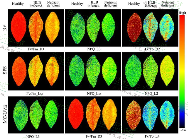 為深入解析HLB感染葉片的光合特征,本研究采用三種特征選擇方法結(jié)合監(jiān)督分類(lèi)器進(jìn)行算法分析,成功識(shí)別出該病害特有的熒光信號(hào),并實(shí)現(xiàn)健康葉片、HLB感染葉片及營(yíng)養(yǎng)缺乏葉片的精準(zhǔn)分類(lèi)。