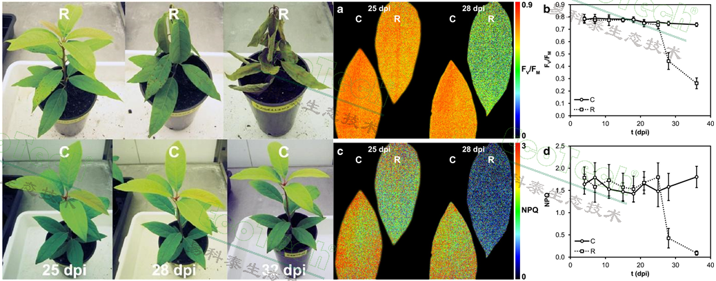 鱷梨苗感染不同天數(shù)后外觀變化(R為感染組,C為對(duì)照組);葉片光合參數(shù)變化(a.最大光量子效率Fv/Fm,b. Fv/Fm定量分析,c.非光化學(xué)熒光淬滅NPQ,d.NPQ定量分析)