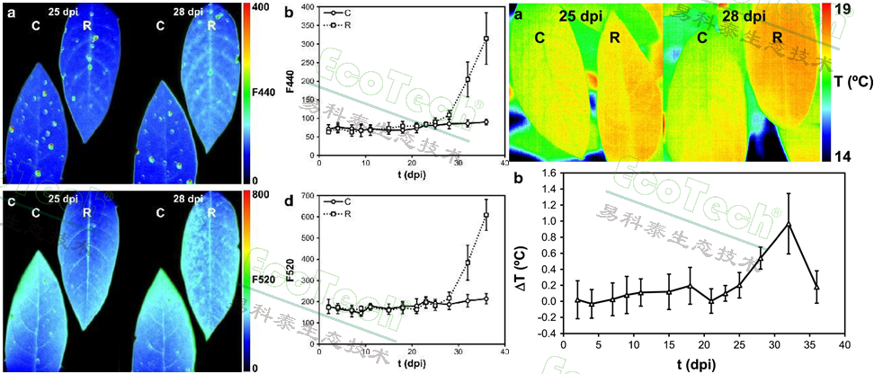 研究中還使用了多光譜熒光成像、紅外熱成像技術(shù)分別對(duì)次級(jí)代謝、葉片溫度進(jìn)行檢測(cè),分析病害對(duì)鱷梨代謝、蒸騰作用的影響。結(jié)合葉綠素?zé)晒獬上?、多光譜熒光成像與紅外熱成像的方法,是一種診斷病菌侵染與病害發(fā)生的有效手段,且能在癥狀發(fā)生前,早期篩選潛在的受感染植物。