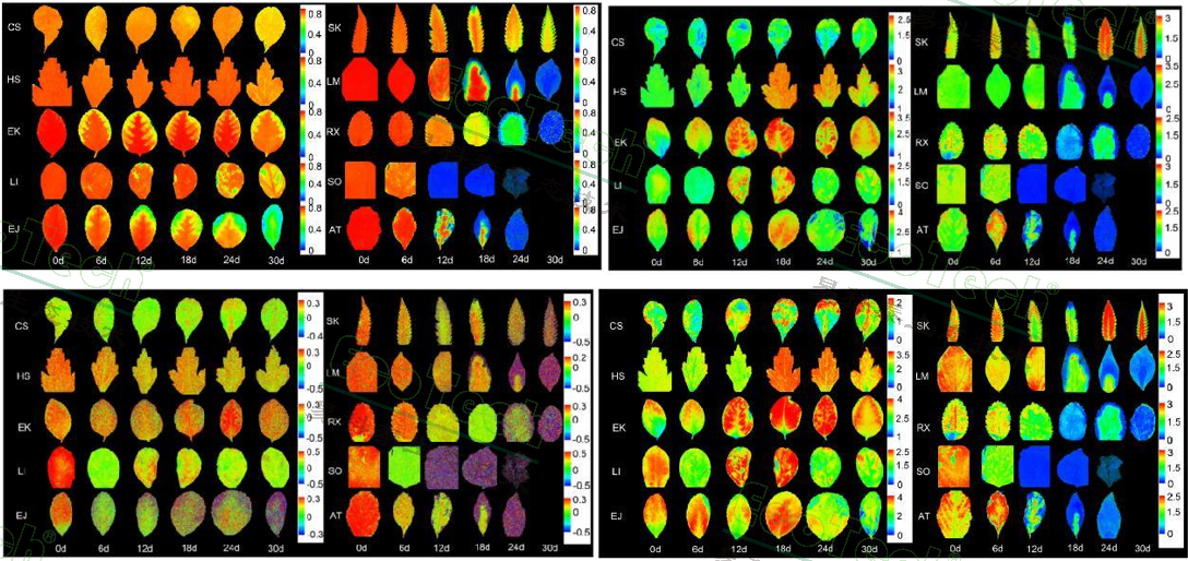 研究中選取了貼梗海棠(CS)、木槿(HS)、膠東衛(wèi)矛(EK)、南陽(yáng)杜鵑(LI)、日本衛(wèi)矛(EJ)、珍珠梅(SK)、金銀忍冬(LM)、黃刺玫(RX)、紫丁香(SO)、榆葉梅(AT)等十種灌木,通過(guò)30天的淹水處理,結(jié)合葉綠素儀與FluorCam熒光成像系統(tǒng),無(wú)損監(jiān)測(cè)了葉片葉綠素含量與多項(xiàng)熒光參數(shù)的變化。結(jié)果顯示: