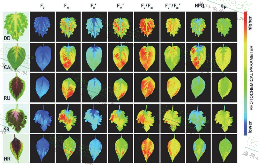 研究發(fā)現(xiàn),葉片不同色素區(qū)域及不同品種間存在顯著差異:雖然紫色部分的葉綠素濃度高于綠色部分,但F0,Fm,F0’和Fm’均略低于綠色區(qū)域,這表明花青素和類胡蘿卜素在紅色區(qū)域中含量較高,具有光保護(hù)作用。