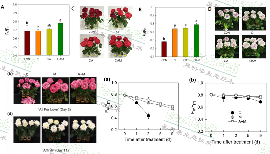 除了觀賞植物育種、脅迫方面的研究,葉綠素?zé)晒獬上襁€可應(yīng)用于花卉采后保鮮等領(lǐng)用,用于評(píng)估鮮切花質(zhì)量、保鮮技術(shù)等。鮮切花尤其是鮮切月季在采摘運(yùn)輸過(guò)程中,保鮮處理也是非常重要的,而鮮花的保鮮技術(shù)與水果蔬菜又有很大不同。韓國(guó)世宗大學(xué)在相關(guān)研究中,對(duì)不同品種的月季施加了各種防腐液與乙烯抑制劑,以評(píng)估最佳的保鮮運(yùn)輸方法。FluorCam葉綠素?zé)晒饧夹g(shù)為鮮花活力評(píng)估鑒定提供了最有力的證據(jù)。