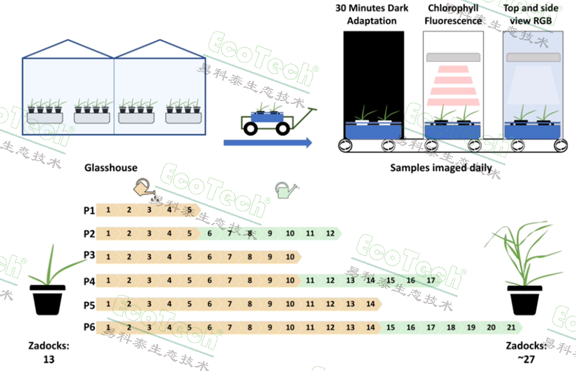 每種處理(P1–P6)均對(duì)兩個(gè)基因型(RGT Planet 與 Glasnevin no.5)設(shè)置5個(gè)重復(fù),按圖中所示的水淹時(shí)間(橙色)與恢復(fù)時(shí)間(綠色)進(jìn)行處理;另設(shè)同等數(shù)量、植株大小一致的對(duì)照,保持正常澆水,采用裂區(qū)設(shè)計(jì)(以水分處理為主區(qū)、品種為副區(qū))。所有植株在破壞性取樣前每日進(jìn)行圖像采集。