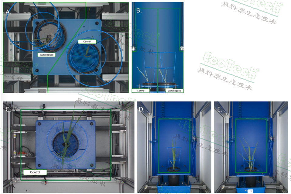 A、B為都柏林大學(xué)實(shí)驗(yàn)1的俯視與側(cè)視示意圖,脅迫第4天使用PlantScreen™系統(tǒng)采集的 RGT Planet品種的圖像;綠色線標(biāo)示單株分割區(qū)域,圖中藍(lán)色支架用于防止葉片越界。C、D、E為亞眠大學(xué)實(shí)驗(yàn)2 的俯視與 0°、90°雙側(cè)視配置,綠色線對(duì)應(yīng)RGB成像室單次拍攝的分割邊界,示例為第14天對(duì)照植株。每次灌溉與拍攝后,所有培養(yǎng)盆均返回生長(zhǎng)室內(nèi)預(yù)設(shè)固定位置。