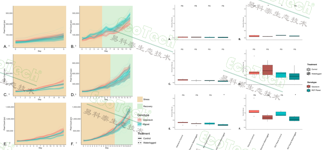圖3(左) 實(shí)驗(yàn)1中Glasnevin no.5與RGT Planet兩品種在水淹與對(duì)照條件下的地上部投影面積PSA(n = 5)。橙色區(qū)段為脅迫持續(xù)期,綠色區(qū)段為恢復(fù)期;PSA為側(cè)視與俯視分割像素之和。A–F分別對(duì)應(yīng)處理P1–P6。
