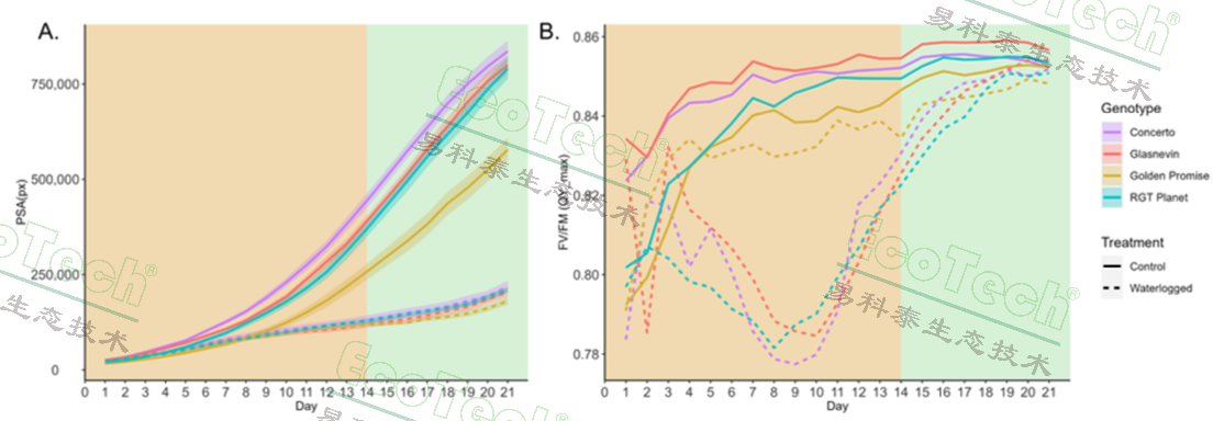 使用PlantScreen™成像平臺(tái),每天從頂部和側(cè)面拍攝RGB圖像,以量化水淹脅迫對(duì)生長(zhǎng)和綠色度的生理影響。通過圖像分析軟件PlantScreen™ Analyzer計(jì)算地上部投影面積(PSA,側(cè)視與俯視分割像素之和),以評(píng)估植物的生長(zhǎng)情況。此外,在實(shí)驗(yàn)2中,還進(jìn)行了FluorCam動(dòng)態(tài)葉綠素?zé)晒獬上?,以評(píng)估植物的光合性能。