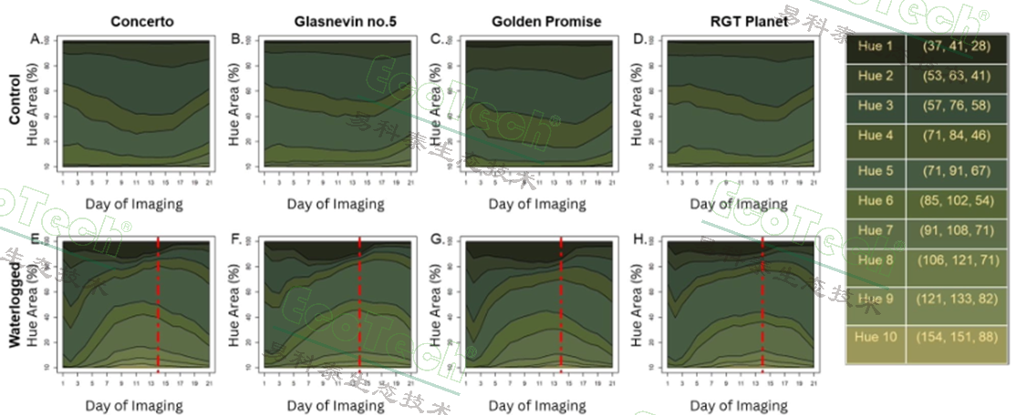 (A–D)對(duì)照條件下4種基因型大麥的表現(xiàn);(E–H)相應(yīng)基因型在脅迫條件下的表現(xiàn)。紅色豎線標(biāo)示脅迫結(jié)束與恢復(fù)期開始。圖中給出各色調(diào)的RGB值與十六進(jìn)制色碼。