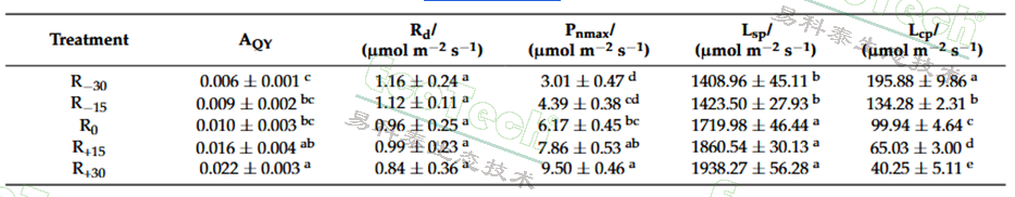 研究設(shè)置 5 個(gè)降雨梯度(基準(zhǔn)值±15%、±30% 及基準(zhǔn)值),采用易科泰光合表型方案測(cè)定裸果木幼苗的凈光合速率、蒸騰速率等氣體交換參數(shù),并通過(guò)光響應(yīng)曲線分析獲得表觀量子效率、最大光合速率等核心指標(biāo)。結(jié)果顯示,降雨增加顯著提升裸果木凈光合速率和蒸騰速率,而降雨減少時(shí),凈光合速率下降由氣孔限制(減少 15%)和非氣孔限制(減少 30%)共同導(dǎo)致,同時(shí)葉片瞬時(shí)水分利用效率顯著提高。