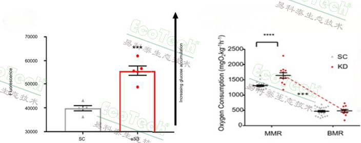 圖左:斑馬魚胚胎階段以2D6P攝取評估代謝率;圖右:成年后斑馬魚的最大氧氣消耗率(MMR)和基礎代謝率(BMR)