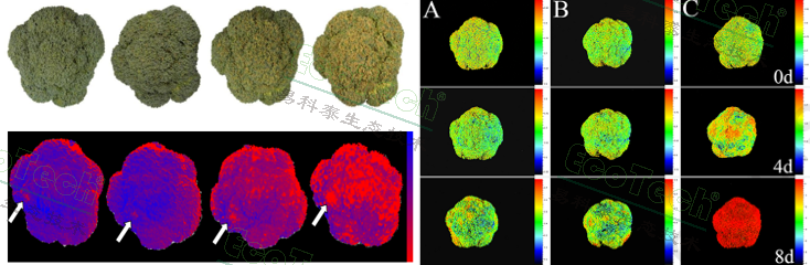 左圖為德國萊布尼茨農(nóng)業(yè)工程和生物經(jīng)濟(jì)研究所花椰菜保鮮研究(Theresa kabakeris, 2018):采摘后10℃儲存1-4天花椰菜的Fv/Fm葉綠素?zé)晒獬上駡D;右圖為沈陽農(nóng)業(yè)大學(xué)(Huixin Fang etc. , 2020)利用FluorCam葉綠素?zé)晒獬上駥ㄒ说难芯?,證實(shí)茉莉酸在花椰菜采后黃化中的調(diào)控作用,茉莉酸合成抑制劑能夠減緩花椰菜黃化