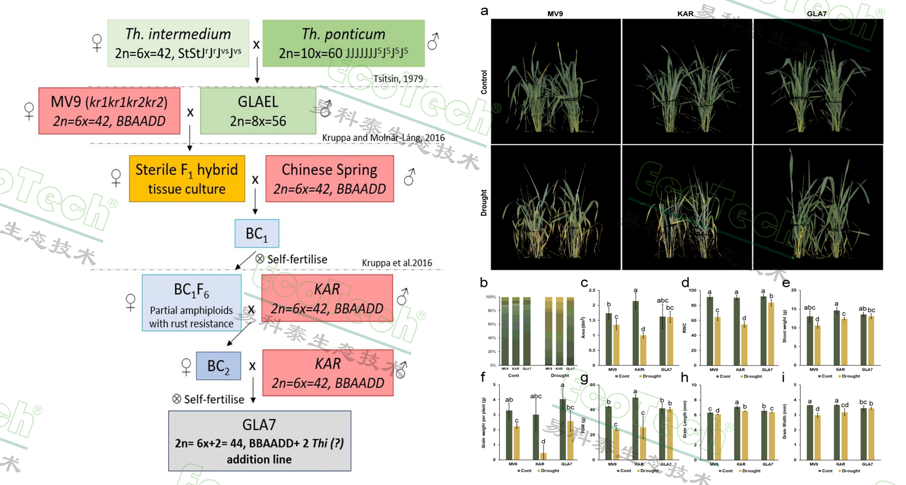 小麥的野生近緣種Thinopyrum屬(特別是中間偃麥草Th. intermedium和長穗偃麥草Th. ponticum)具有優(yōu)異的抗逆性。匈牙利農(nóng)業(yè)研究中心的科學家利用這兩種偃麥草的雜交種Agropyron glel(GLAEL)來開發(fā)新型小麥抗性品種。他們通過小麥品種MV9與GLAEL雜交,經(jīng)多代回交選育出44條染色體的附加系GLA7。