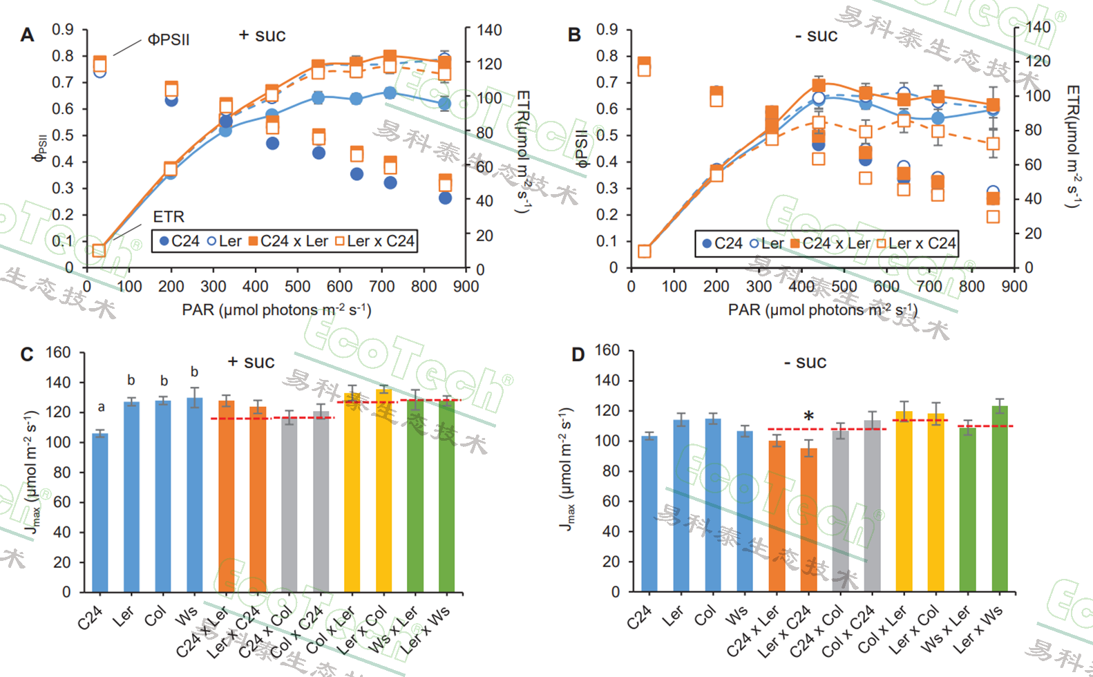 研究人員通過FluorCam葉綠素熒光成像系統(tǒng)的light curve光響應曲線測量程序,測量了雜交種和親本在不同光強下的量子產(chǎn)額ΦPSII與電子傳遞速率ETR,并進一步擬合出最大電子傳遞速率Jmax(即ETRmax)。結(jié)果表明雜交種和親本在光系統(tǒng)II效率方面沒有顯著差異。