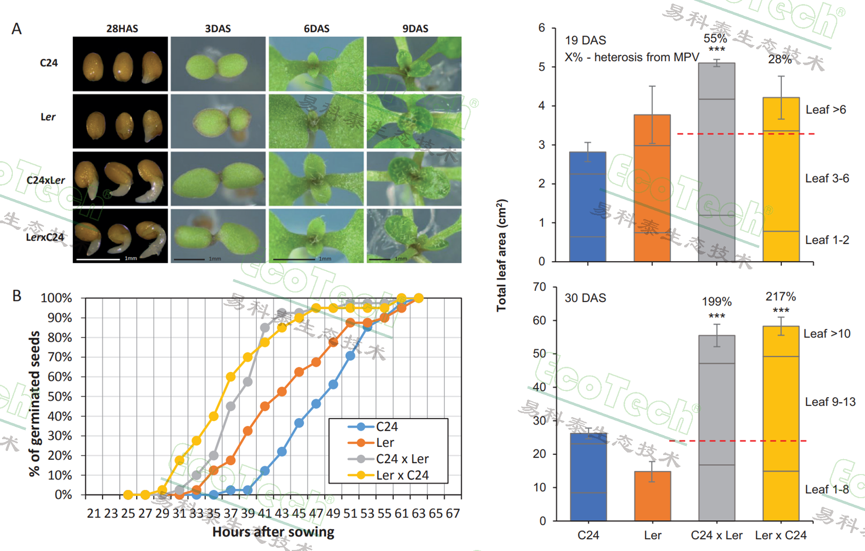 擬南芥Arabidopsis thaliana雜交種往往會表現(xiàn)出生物量增加的雜種優(yōu)勢。澳大利亞聯(lián)邦科學和工業(yè)研究組織與悉尼科技大學合作,旨在確定擬南芥雜交種生物量增加是由于單位葉面積光合效率提高,還是總體葉面積增加導致總光合產(chǎn)物增多。
