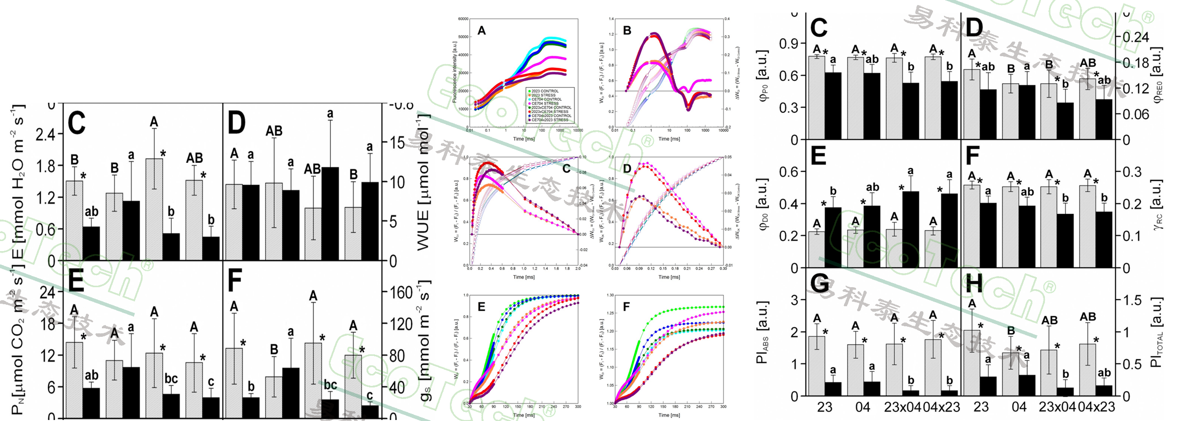 左圖:光合儀測量的凈光合速率(Pn)、蒸騰速率(E)、氣孔導度(gs)、水分利用效率(WUE)等;中圖:FluorPen手持式葉綠素熒光儀測量的OJIP快速葉綠素熒光動力學曲線;右圖;基于OJIP曲線得到的一系列參數(shù)