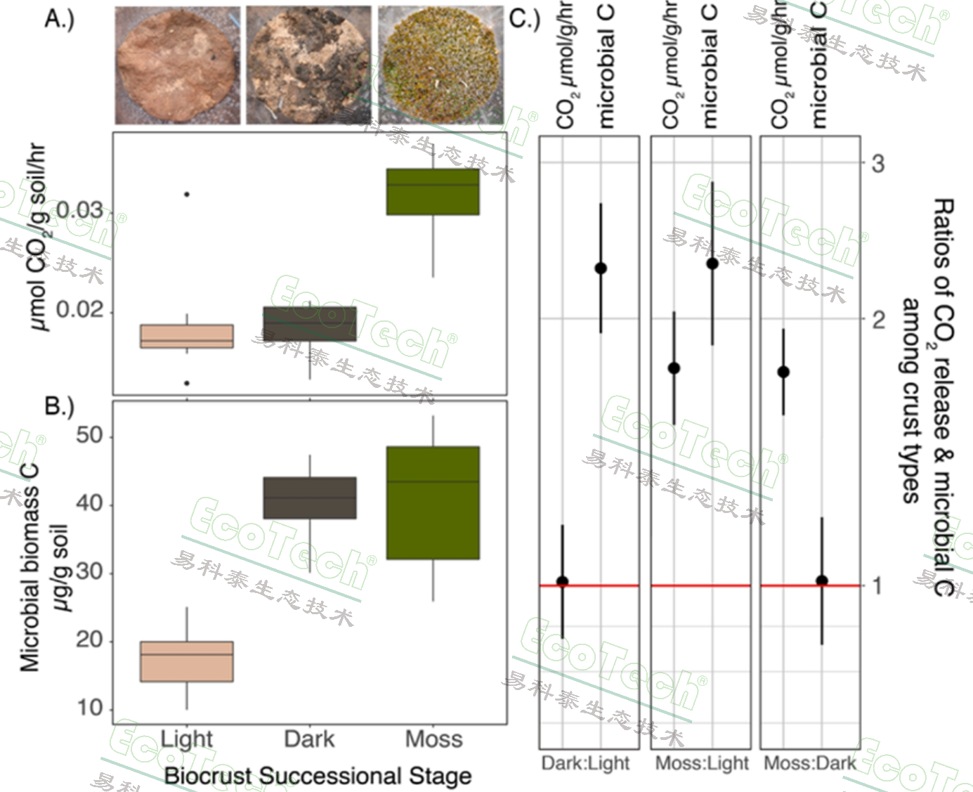 美國德克薩斯大學的Kristina等,研究了生物結(jié)皮滲漏液在促進地下營養(yǎng)和可溶性碳庫以及地下微生物循環(huán)中的作用。使用SoilLab土壤呼吸測量系統(tǒng)測量不同演替階段的生物結(jié)皮下的土壤樣本呼吸速率,用于評估土壤微生物的生物量和其活性,發(fā)現(xiàn)生物結(jié)皮和地下礦質(zhì)土壤之間的養(yǎng)分和C連通性程度取決于生物結(jié)皮演替階段和其養(yǎng)分元素可以通過對養(yǎng)分的可利用性和CO2通量的反饋,來評估旱地土壤的生物地質(zhì)化學循環(huán)狀況。(參考文獻:Young K E, et al. Vertical movement of soluble carbon and nutrients from biocrusts to subsurface mineral soils[J]. Geoderma, 2022.)