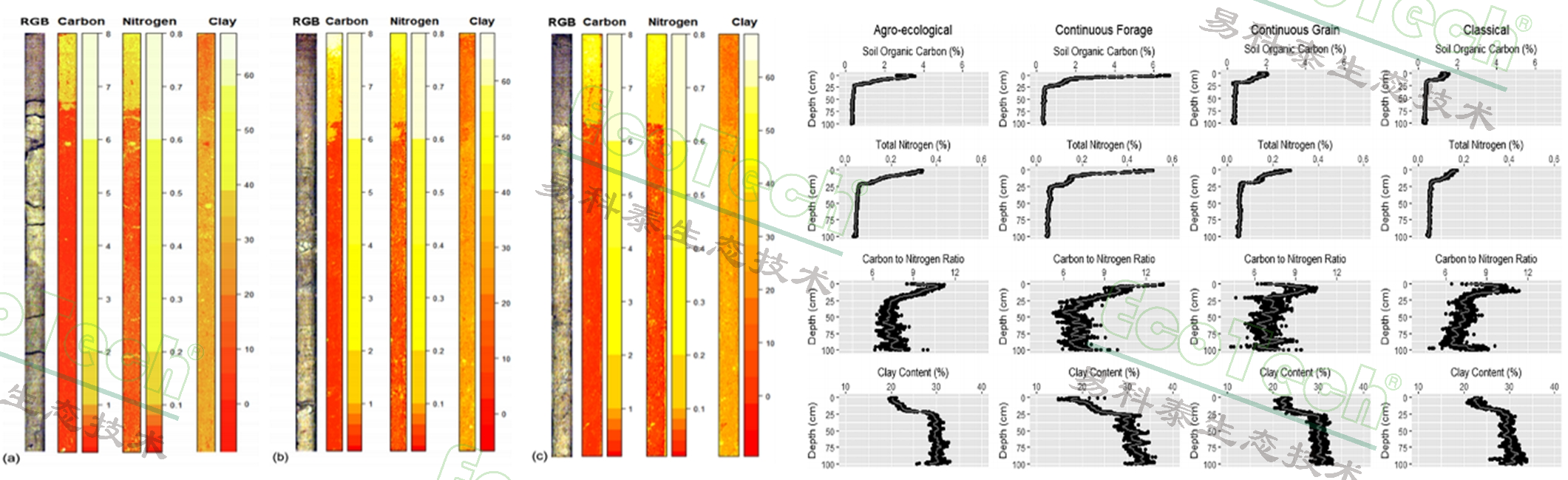 加拿大阿爾伯特大學的研究者Sorenson利用Specim SisuROCK高光譜成像系統(tǒng),采集三種不同輪作土壤剖面的VNIR-SWIR高光譜數(shù)據(jù),結(jié)合元素分析儀建立有機碳SOC和氮TN預測模型,發(fā)現(xiàn)輪作中添加牧草增加了土壤SOC和TN的含量,多集中在表層。(參考文獻:Sorenson P T, Quideau S A, Rivard B, et al. Distribution mapping of soil profile carbon and nitrogen with laboratory imaging spectroscopy[J]. Geoderma, 2020.)