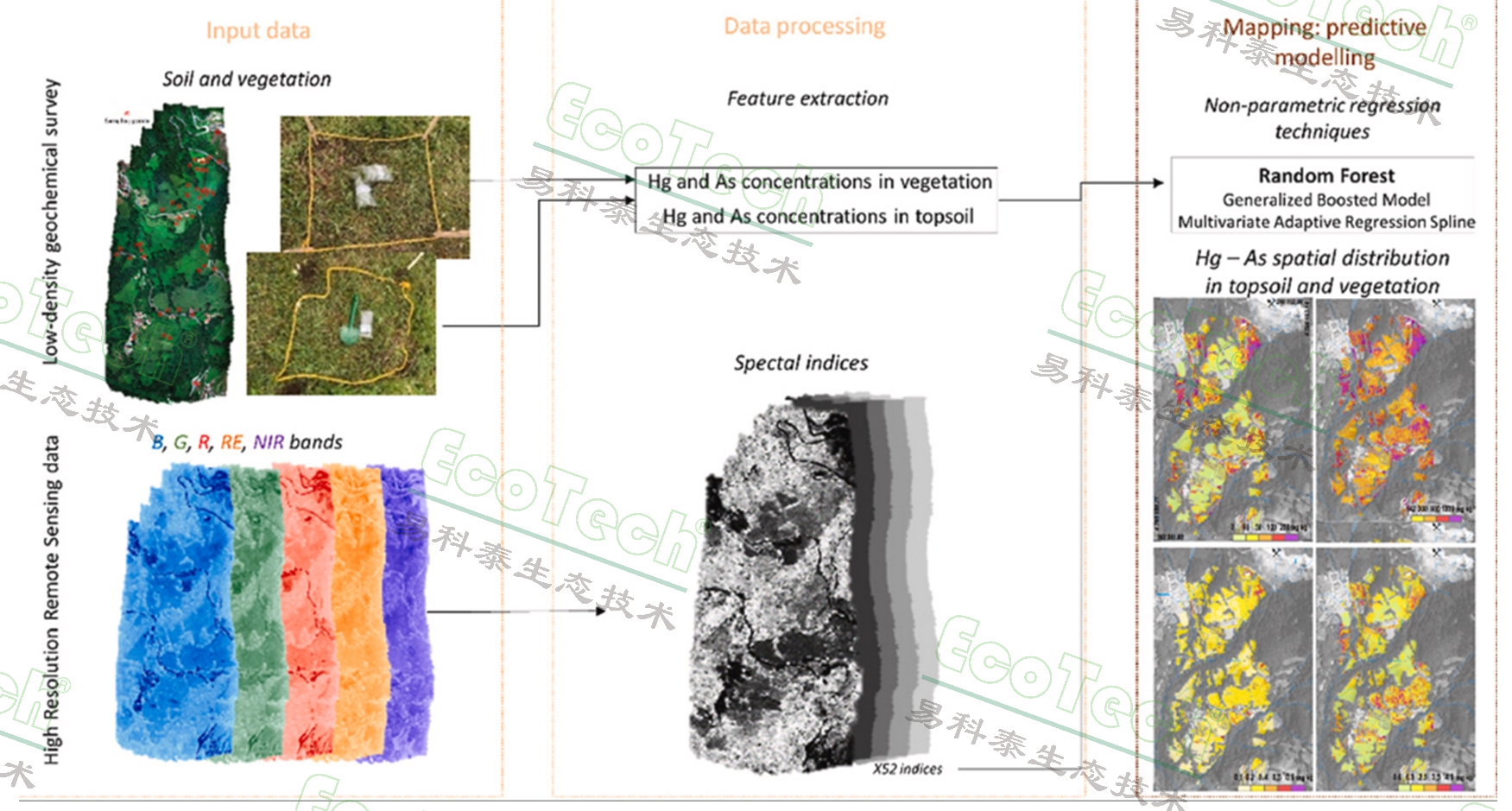 西班牙奧維耶多大學的研究人員基于地面地球化學調(diào)查、無人機遙感獲取的高光譜數(shù)據(jù)以及機器學習技術實現(xiàn)了對土壤污染物分布的穩(wěn)健預測。其中,隨機森林模型為土壤和植被中的As和Hg濃度提供了最佳的無偏模型,對污染物含量和分布的預測與地面實測化學數(shù)據(jù)吻合良好,且對As的預測精度高于Hg。(參考文獻:Salgado L, López-Sánchez C A, Colina A, et al. Hg and As pollution in the soil-plant system evaluated by combining multispectral UAV-RS, geochemical survey and machine learning[J]. Environmental Pollution, 2023)