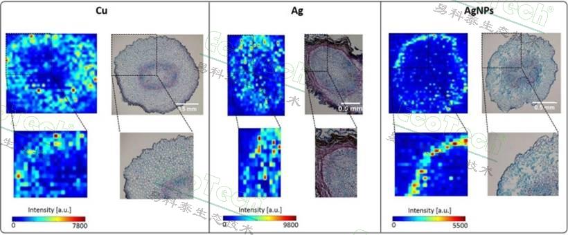 根部在植物養(yǎng)分供應(yīng)、抵御過量金屬離子毒害等方面發(fā)揮著關(guān)鍵作用,但根部元素分析的難度遠(yuǎn)高于莖部組織:與莖、芽相比,植物根部更為細(xì)小且干物質(zhì)含量低,不僅不易精準(zhǔn)切割,且待分析元素相對(duì)含量較低;同時(shí),根部樣品柔軟多汁,難以維持原有結(jié)構(gòu)形態(tài),這給元素分布的精準(zhǔn)檢測(cè)帶來了極大挑戰(zhàn)。本案例采用雙激發(fā) LIBS 技術(shù),對(duì)蠶豆幼苗根部納米銀顆粒(直徑 21.7±2.3 nm)開展 mapping(元素分布圖)分析,可直接檢測(cè)自然狀態(tài)下的植物組織元素,不僅獲得了較高的 mapping 分辨率,更保障了檢測(cè)靈敏度 —— 這也是 LIBS 技術(shù)領(lǐng)域首次實(shí)現(xiàn)對(duì)植物根部納米顆粒分布的精準(zhǔn)分析。
