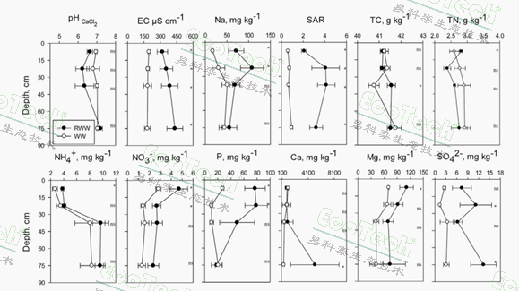 圖2. 不同灌溉方式(再生廢水 RWW、井水 WW)下,不同深度土壤剖面中硝酸氮、銨態(tài)氮及無機(jī)元素含量對(duì)比圖