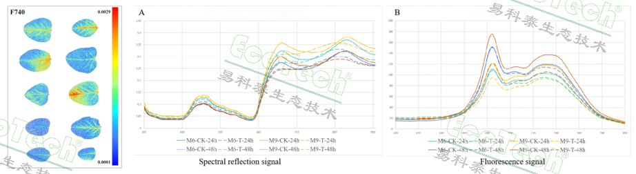 圖5. 左上圖:不同濃度農(nóng)藥對(duì)大豆的影響實(shí)驗(yàn)(圖為740nm波段葉綠素?zé)晒獬上?,為易科泰公司與與中國農(nóng)科院植保所合作項(xiàng)目);右上圖為銅脅迫甜瓜反射光光譜及葉綠素?zé)晒夤庾V(引自Miao Huang etc., Journal of Hazardous Materials,2025);左下圖:不同年份西洋參檢測(cè)實(shí)驗(yàn)(易科泰公司與吉林農(nóng)業(yè)大學(xué)合作項(xiàng)目)右下圖:種子發(fā)芽試驗(yàn);