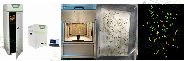 左圖:新一代FluorCam1300多激發(fā)光多光譜熒光成像系統(tǒng);中:FluorTron®植物光合表型成像分析系統(tǒng);右:利用易科泰葉綠素?zé)晒獬上窦夹g(shù)測量番茄種子萌發(fā)率并評估種苗活力